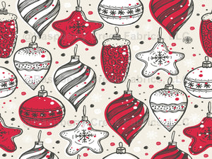 Christmas Collection: Red and white ornaments on cream background with stars, balls, striped, polka dots and teardrop styles from a Christmas tree.