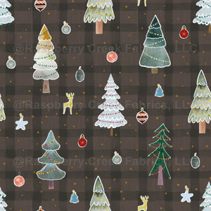 Handpainted Christmas trees and ornamenst in green, blue and aqua over a dark brown gingham pattern with golden stars.