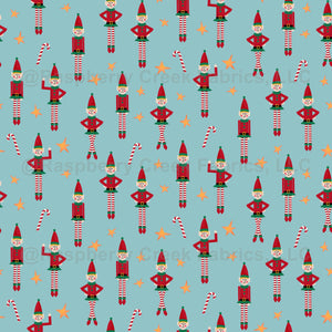 Cheerful red and green elves with candy canes and stars on a blue background. A festive holiday print perfect for kids’ Christmas pajamas, holiday outfits, and fun seasonal décor. Part of the Vintage Christmas Ornaments Collection.