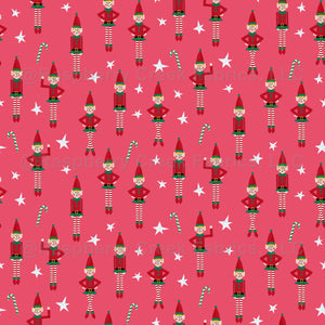 Cheerful red and green elves with candy canes and stars on a coral pink background. A festive holiday print perfect for kids’ Christmas pajamas, holiday outfits, and fun seasonal décor. Part of the Vintage Christmas Ornaments Collection.