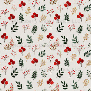 Christmas Flowers, Berries And Leaves, Colorful Ditsy Of Green, Gold, Red, White For Quilters, Sewers, Crafters