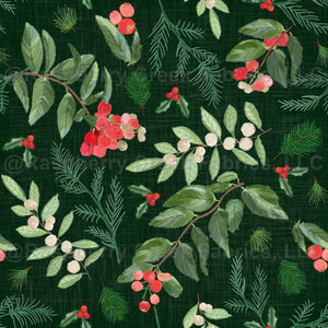 Christmas Foliage of Mistletoe, Holly, Spruce and Australian Lilly Pilly Berries in red, green white and soft pinks on dark green linen texture.
