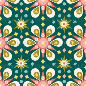 vintage style geometric Christmas repeat pattern design with graphic flowers and stars decorations for the holiday season