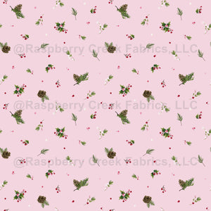 Festive fabric with a pink background featuring tossed pinecones, greenery, and berries. Perfect for holiday sewing, quilting, décor.