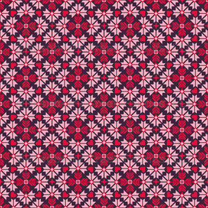 Modern abstract tile and paper cut style pattern with stylized soft pink poinsettia, crimson celestial icon like star, heart on a purple blackground.
