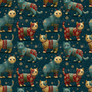 Christmas Kittens In Holiday Sweaters As Snow Falls In Blue, Teal, Gold, Red And Cream