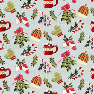 Christmas Morning with Cocoa and Marshmallows, hat and mittens, mistletoe, candy cane, stockings - blue