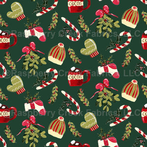 Christmas Morning with Cocoa and Marshmallows, hat and mittens, mistletoe, candy cane, stockings - forest green