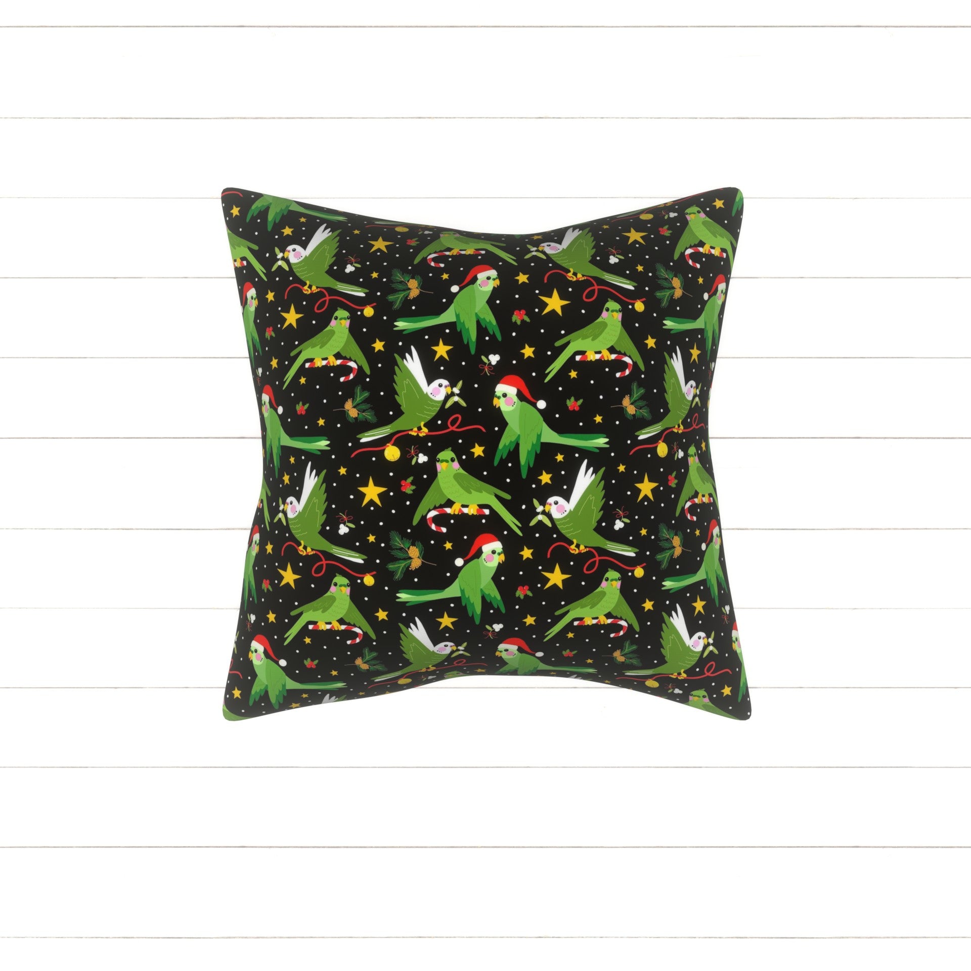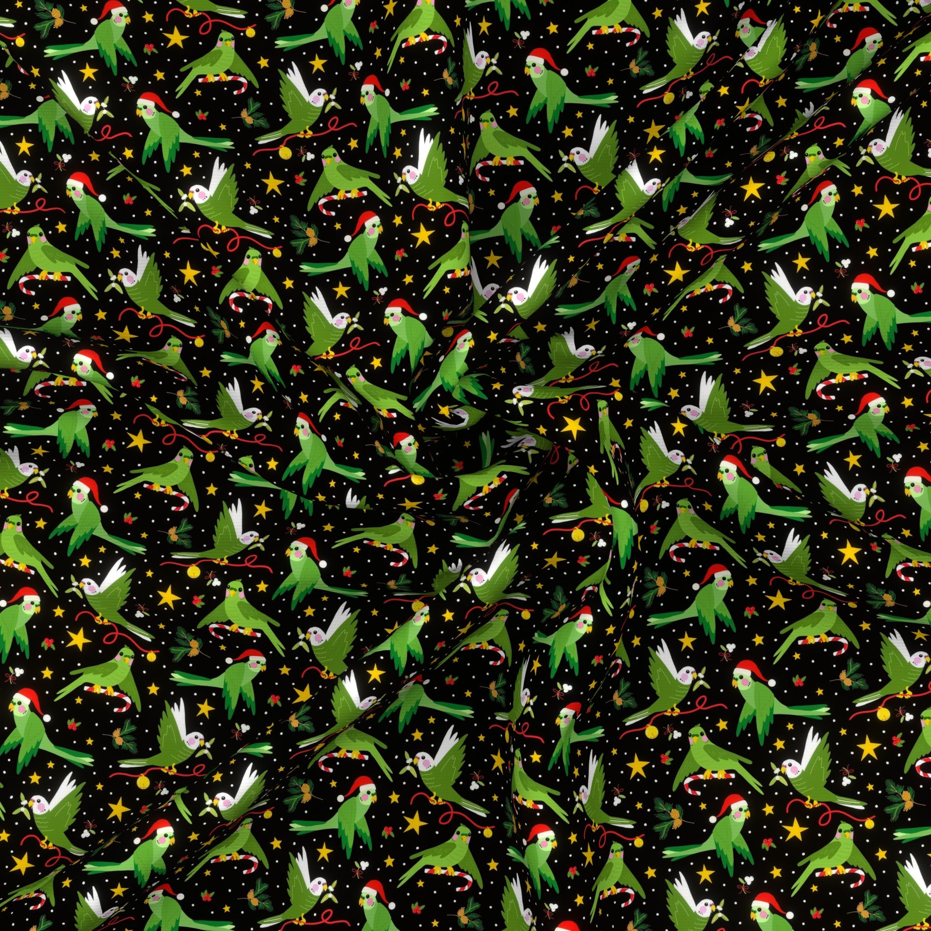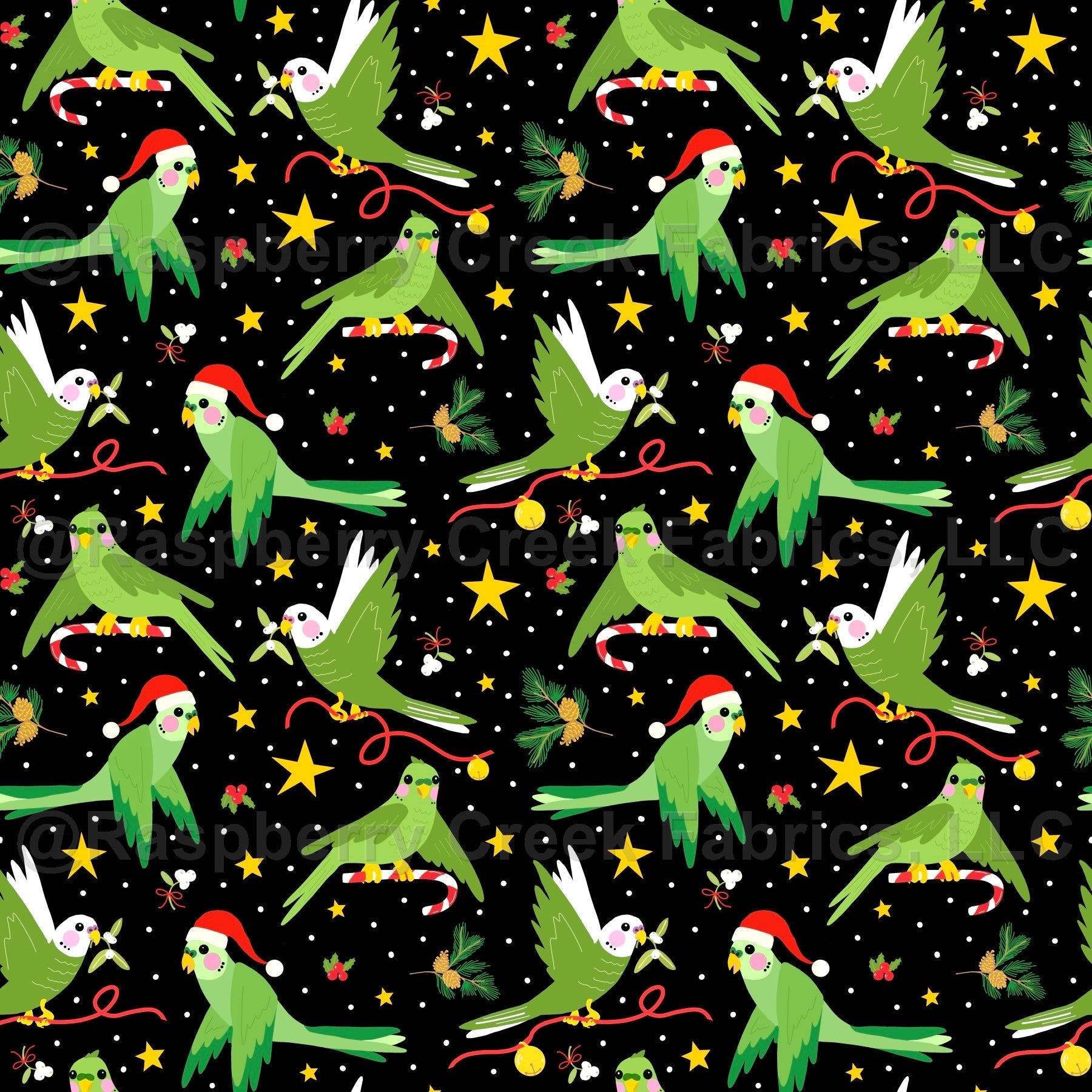 Cheerful holiday themed budgie parakeets on a black polka dot background.