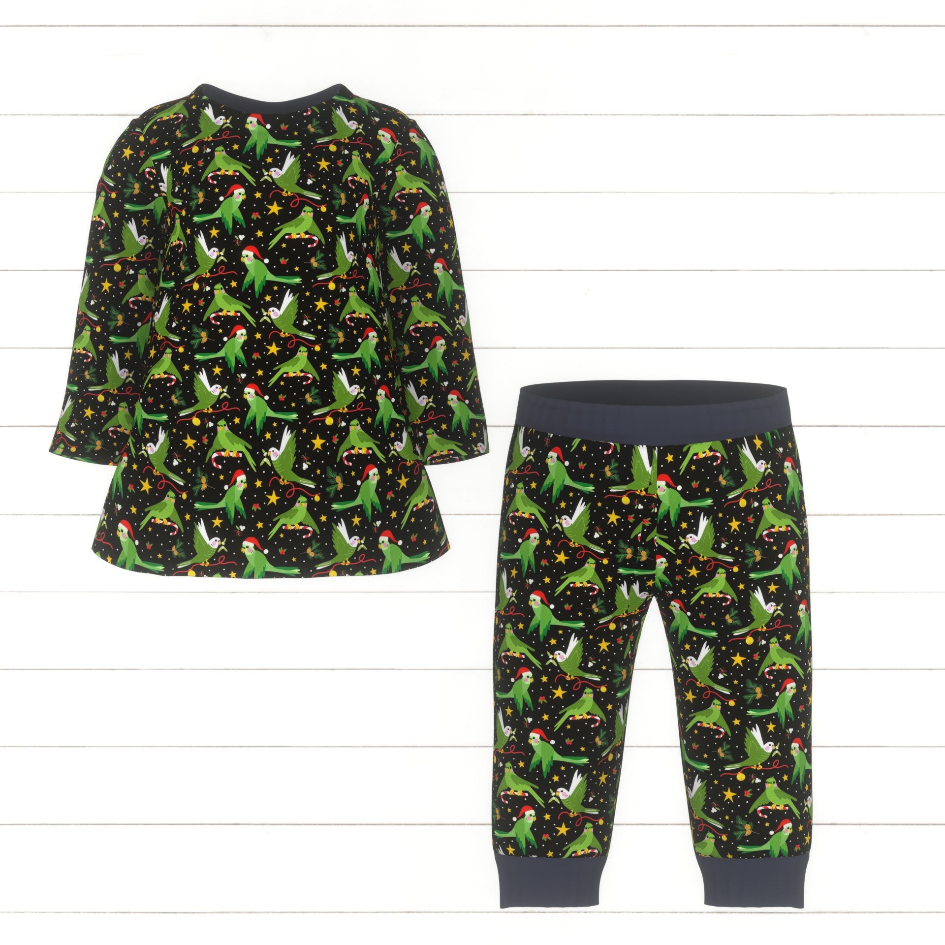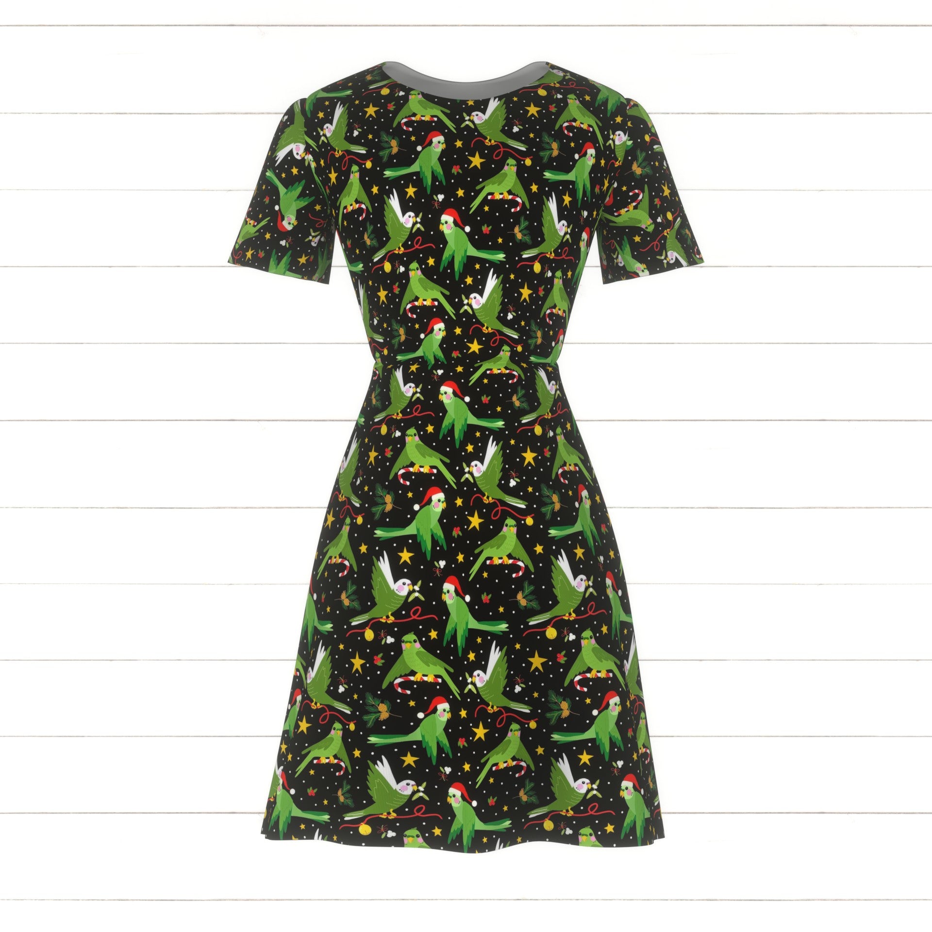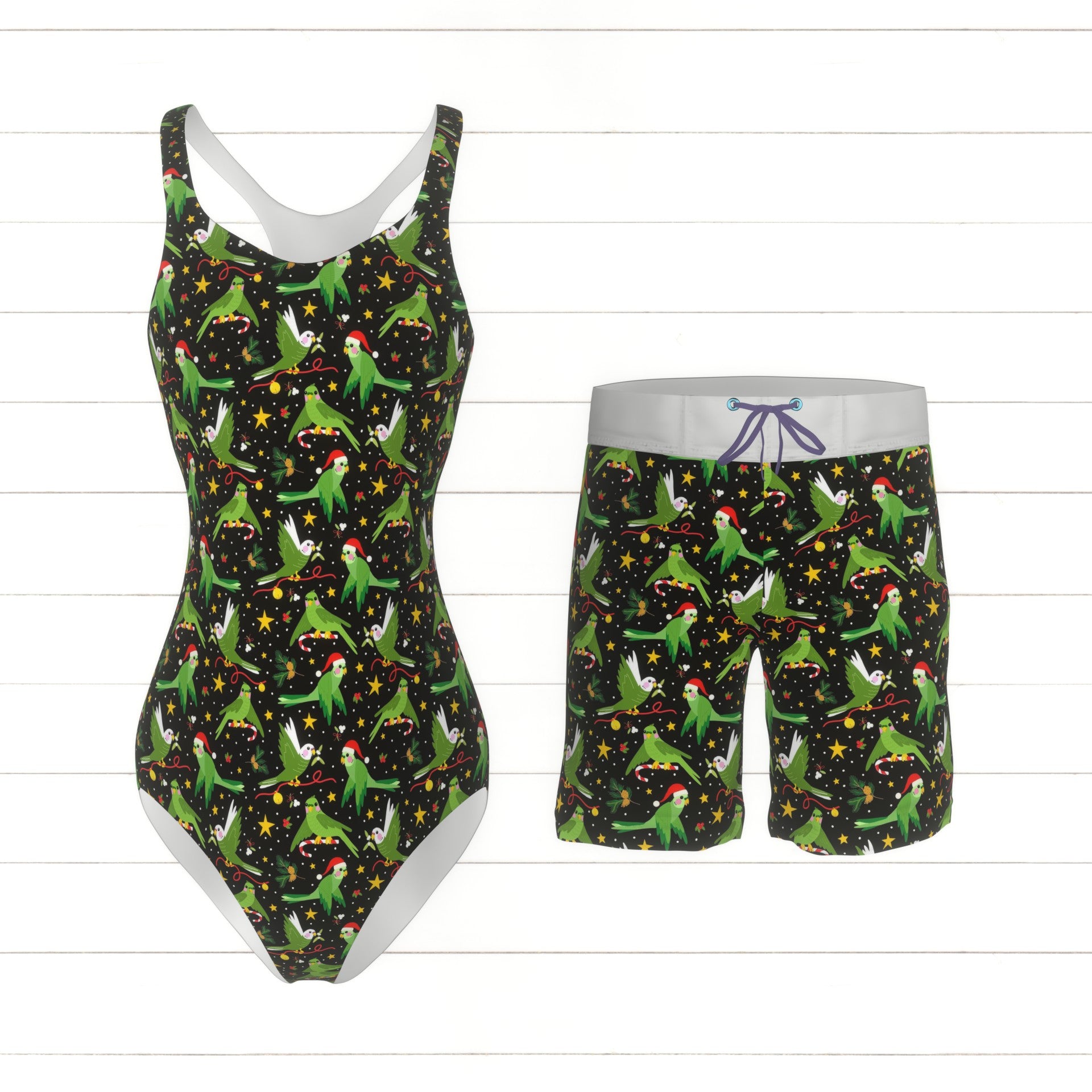 Cheerful holiday themed budgie parakeets on a black polka dot background.