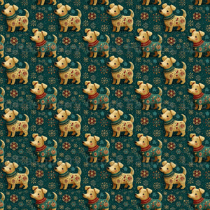 Christmas Puppy In Holiday Sweater Of Red, Cream And Gold, With Snowflakes On Teal Background