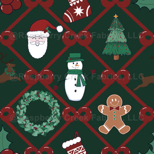 A selection of holiday figures (including trees, gingerbread, and reindeer) decorate a trellis of brightly colored holiday ribbons and bows.