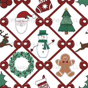 A selection of holiday figures (including trees, gingerbread, and reindeer) decorate a trellis of brightly colored holiday ribbons and bows.