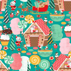 high volume Christmas pattern design for kids with scenes about north pole Santa Claus and his elves helpers decorating their gingerbread headquarter with sweets and treats. Holiday season decorations