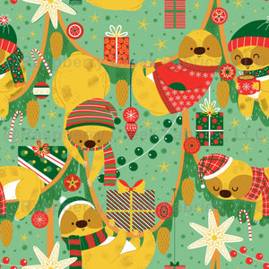 cute sloths with sweathers, scarfs and wool hats hanging fromChristmas tree branches surrounded by ornaments, stars and gift boxes.