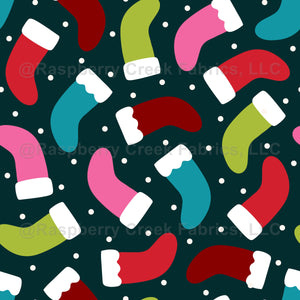 Red, pink, green, teal tossed Christmas stockings