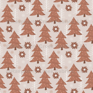Charming Christmas pattern featuring festive trees, delicate flowers and snowflakes in brown and white on a light background.