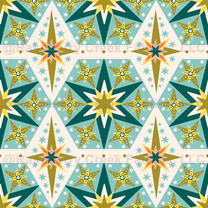 vintage style geometric graphic repeat pattern deign with golden and green teal stars shapes forholiday season decorations