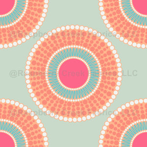 A twist on traditional in our boho abstract circball-inspired polka dot mandala on a solid muted green background using our Sunset on Sea palette.