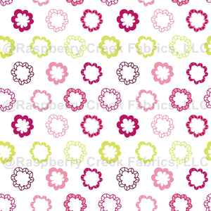 Stylized circular motifs of varied shapes in pink, fuchsia, dark magenta, and chartreuse on a white background.