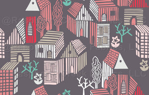 City life neighborhood mauve, Cozy small town life. Minimalist houses in Scandinavian style, looks like cut-outs. Part of the City Life collection.