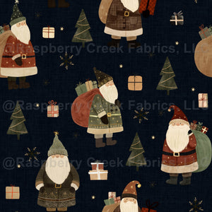 Navy linen background with Santa Claus, Christmas trees, and gifts. Perfect for holiday decor and seasonal projects.