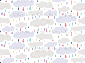 Hand drawn childish cute pattern. Multicolored rain with clouds on white background.