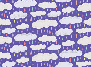 Hand drawn childish cute pattern. Multicolored rain with clouds on purple background.