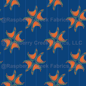Medium sized abstract clover motif in orange, blue, and chartreuse, on a navy blue background pinstriped in light blue.