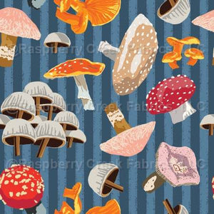 Cluster of Mushrooms on blue stripes - scattered colorful mushrooms - Cabin Country Collection