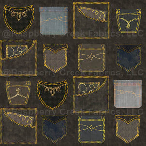 Inspired by the fancy stitches on jean pockets, this design in coffee-washed brown with gold details features different styles of pockets arranged in a grid, with twenty pockets to a square that can be sized from 6 inches up to 24 inches on a side.