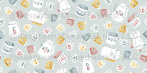 A nostalgic kitchen print for the coffee-lover, featuring mid-century coffee pots and mugs—ideal for cute aprons and accessories, vintage interiors, or diner-inspired café curtains.