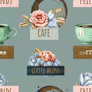This design features a charming, cafe-inspired theme with a muted, vintage aesthetic. The background is a soft, muted teal, creating a calming and cohesive look. Warm browns, greens, and peachy-pink hues serve as key accent colors, enhancing the overall inviting atmosphere. The motifs include watercolor-style illustrations of large, blooming flowers in shades of pink and blue with golden leaves, complemented by textured green coffee cups and playful coffee bean elements. Interspersed throughout the design are words like "Café," "Coffee Beans," "Friends," and "coffee," rendered in a mix of elegant serif and typewriter-like fonts for a touch of rustic charm. Additional details, such as circular coffee stains, add an authentic, playful feel reminiscent of a lively coffee shop. The layout is arranged in a repeating pattern, ensuring a balanced distribution of text, floral elements, and coffee cups.
