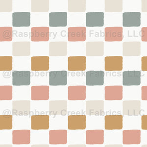 Hand drawn checkers with four colors of green, pink, beige and orange in white