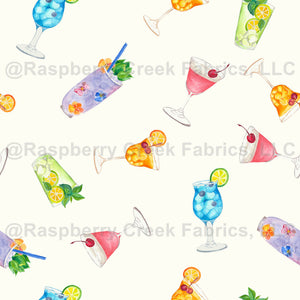 Bright gouache-painted cocktails in vibrant hues pop against a soft cream background—perfect for fun summer projects and party-themed sewing.