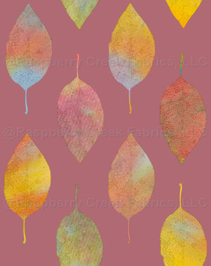 All over repeated colorful leaves. Manipulated photo created the sketch effect of the leaves, which were then individually digitally filled with a colorful monoprint. Leaves are about 1 inch wide and 3.5 inches tall.