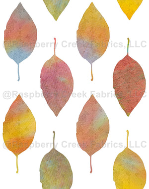 All over repeated colorful leaves. Manipulated photo created the sketch effect of the leaves, which were then individually digitally filled with a colorful monoprint. Leaves are about 1 inch wide and 3.5 inches tall. Transparent background.