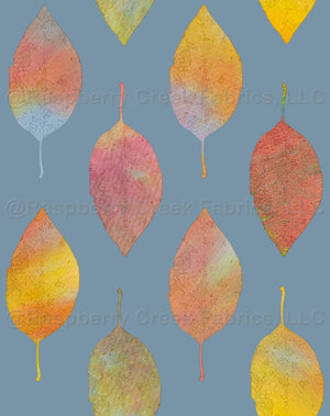 All over repeated colorful leaves. Manipulated photo created the sketch effect of the leaves, which were then individually digitally filled with a colorful monoprint. Leaves are about 1 inch wide and 3.5 inches tall.