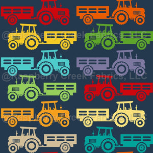 Colorful Farm Tractors and Wagons on Navy