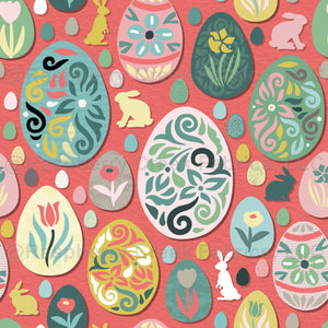 Colorful papercut easter eggs and little bunnies on pinkbackground.