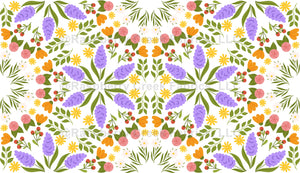 Bright kaleidoscope-style spring floral pattern with geometric arrangement of colorful blooms and foliage.