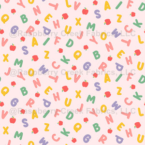 Adorable colourful nursery design featuring alphabets and apples on pink background. Perfect for educational project, nursery décor and kids' crafts