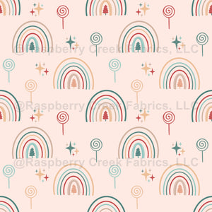 A whimsical and colourful design featuring rainbows, lollipops and stars on orange background. Perfect for holiday crafts and playful seasonal project.