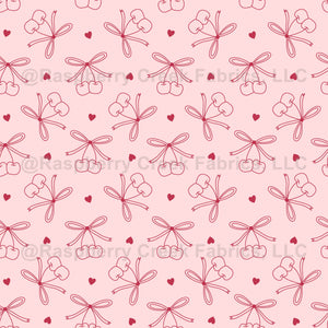 A coquette aesthetic pattern featuring lineart illustrations of cherries with ribbons and decorative heart accents.