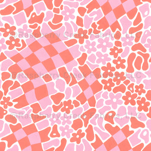 An abstracted floral and checkered pattern, hand painted in designer's gouache.