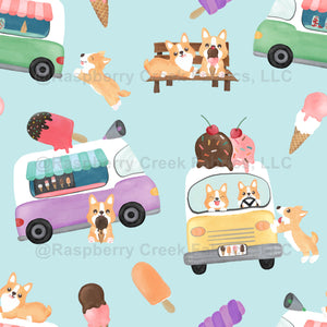 Corgi Ice Cream Trucks Blue. Watercolor corgi pups and ice cream trucks, ice cream cones and popsicles, fun kids pet pattern.