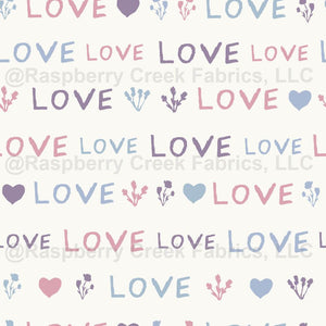 Cottage Love is a sweet typographic print perfect for ayoung one. Shades of lavenders with hand painted hearts and cottage flowers, combined with the words makea delicate repeating stripe pattern. The white areas are a soft off white, nota stark bright white.