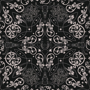 Cow Skull Scrolls, Western, Cowboy, Cowgirl, Horseshoe, Moody, Leather Tooling, Bandana