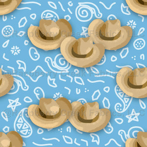 Scattered cowboy hats on a cool blue bandana print.