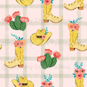 Playful and girly Western-themed pattern with cowboy boots, hats, and blooming cacti on a soft green plaid background. Perfect for Southwestern decor and fashion. Pastel Pink